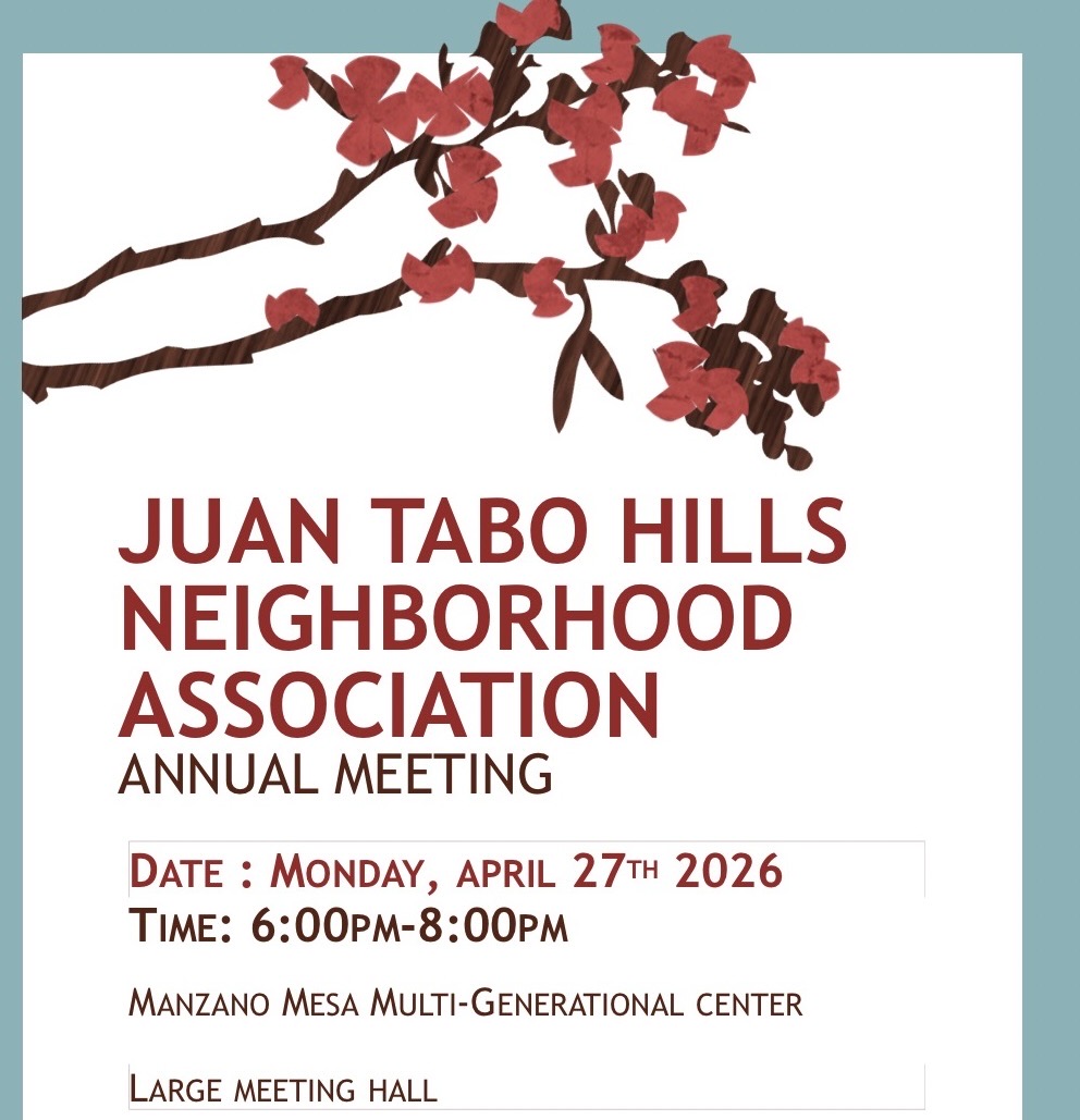 We’re so excited to welcome you to the brand-new website for the Juan Tabo Hills Neighborhood Association (JTHNA)! We built this site with one goal in mind: to make it easier for everyone in our community to stay connected, find what they need, and get in touch....